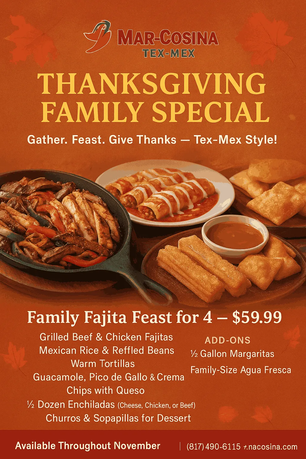 We are Marcos and Ruth Angel and the proud owners of Mar-Cosina. We have been in the hospitality business for years and enjoy serving the community since 2016. It is a family affair as everyone participates in the success of the business and most of our staff is like family and has been with us since the beginning.